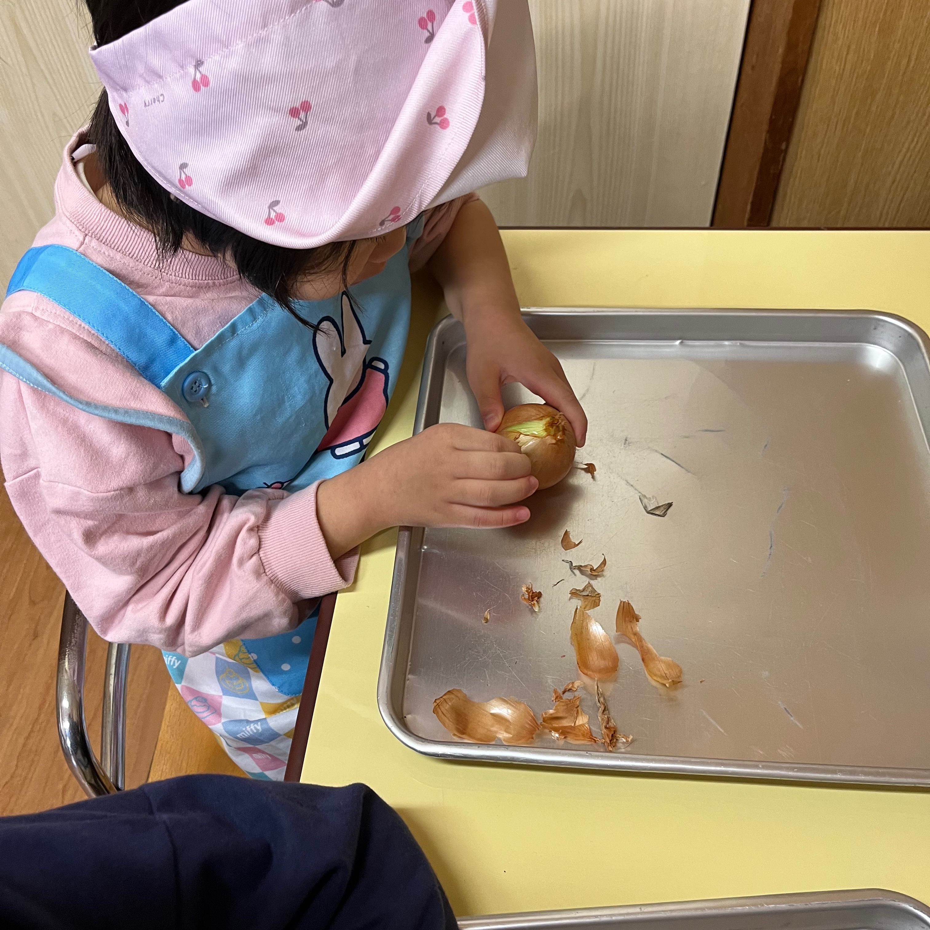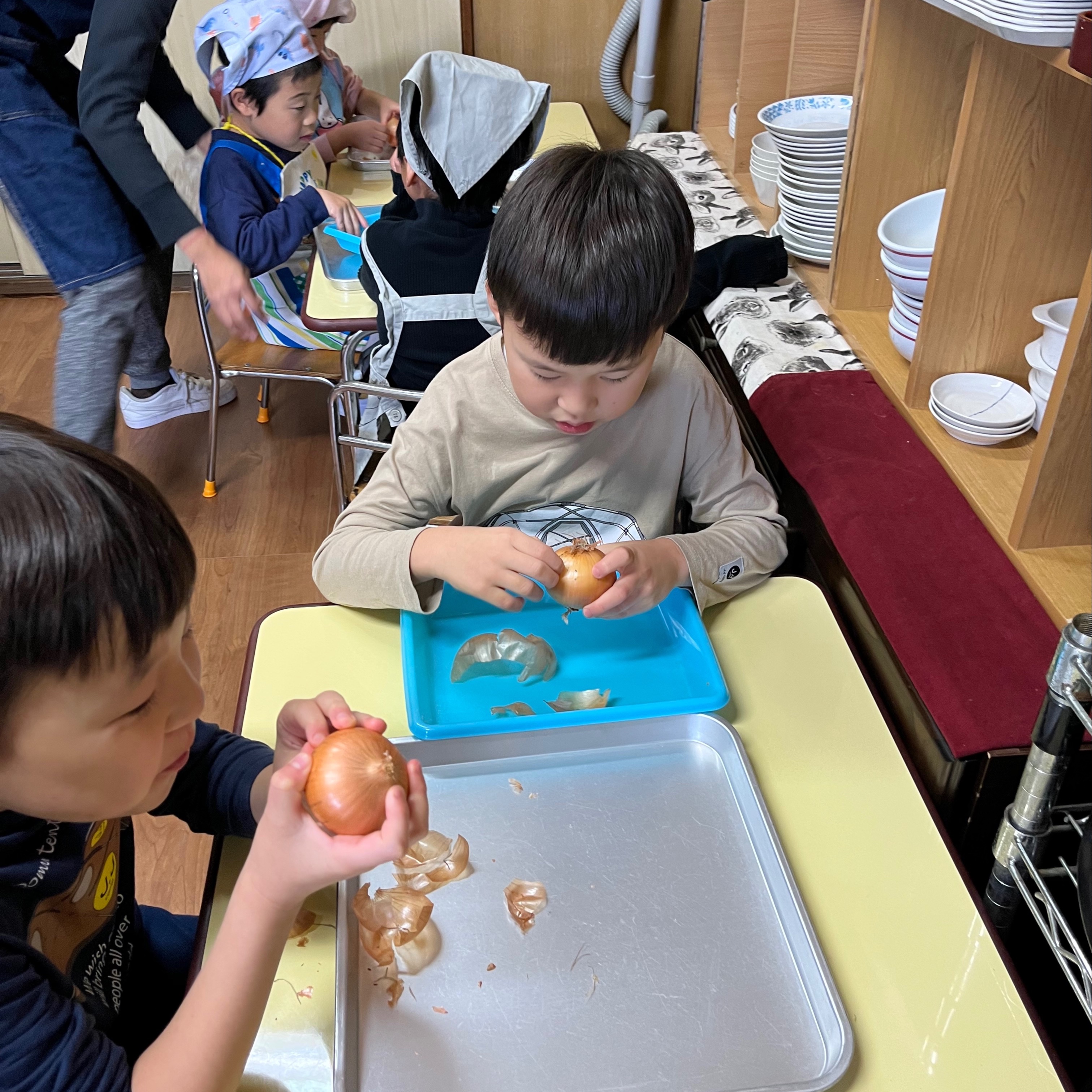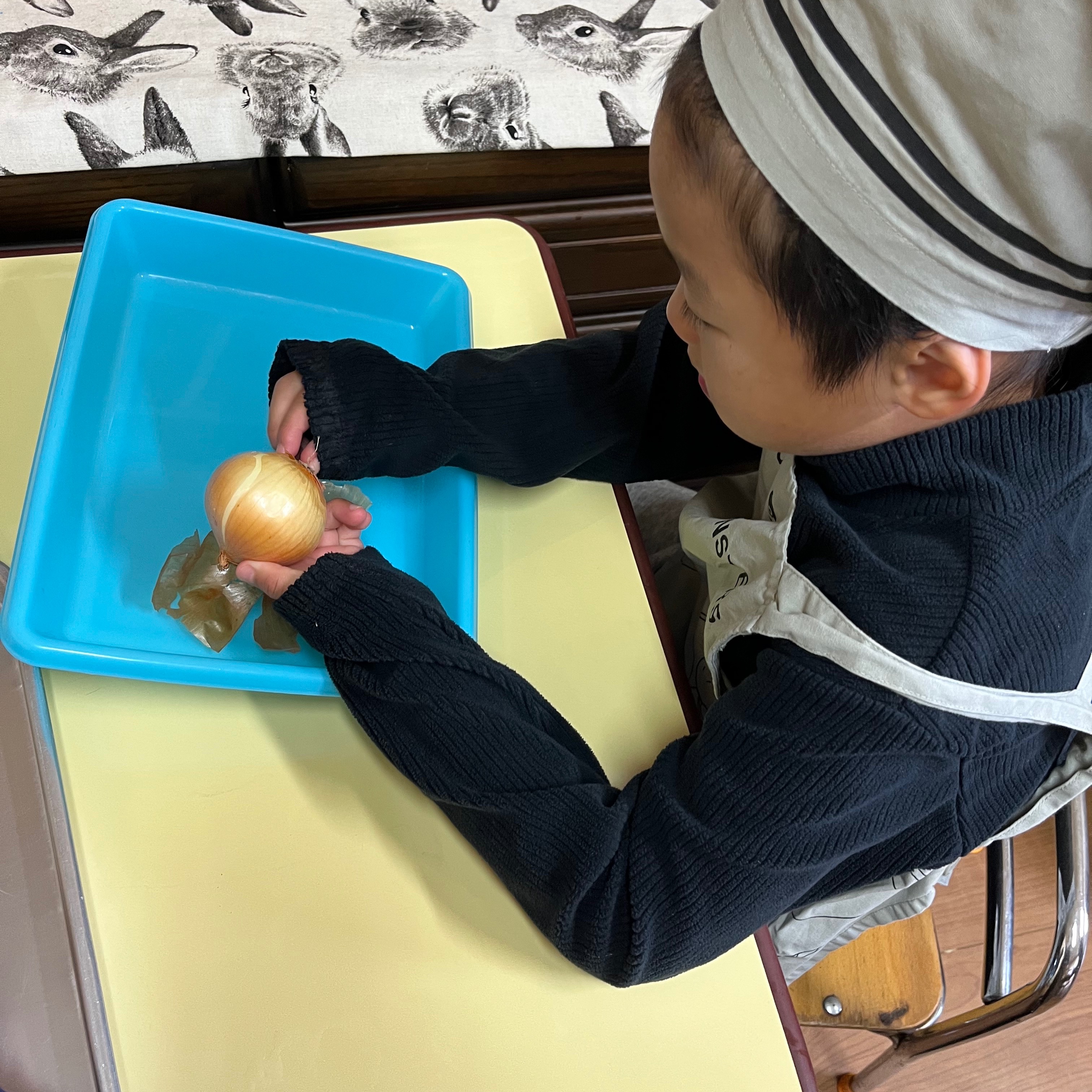 玉ねぎの皮をむくのはみんな慣れてきたようで